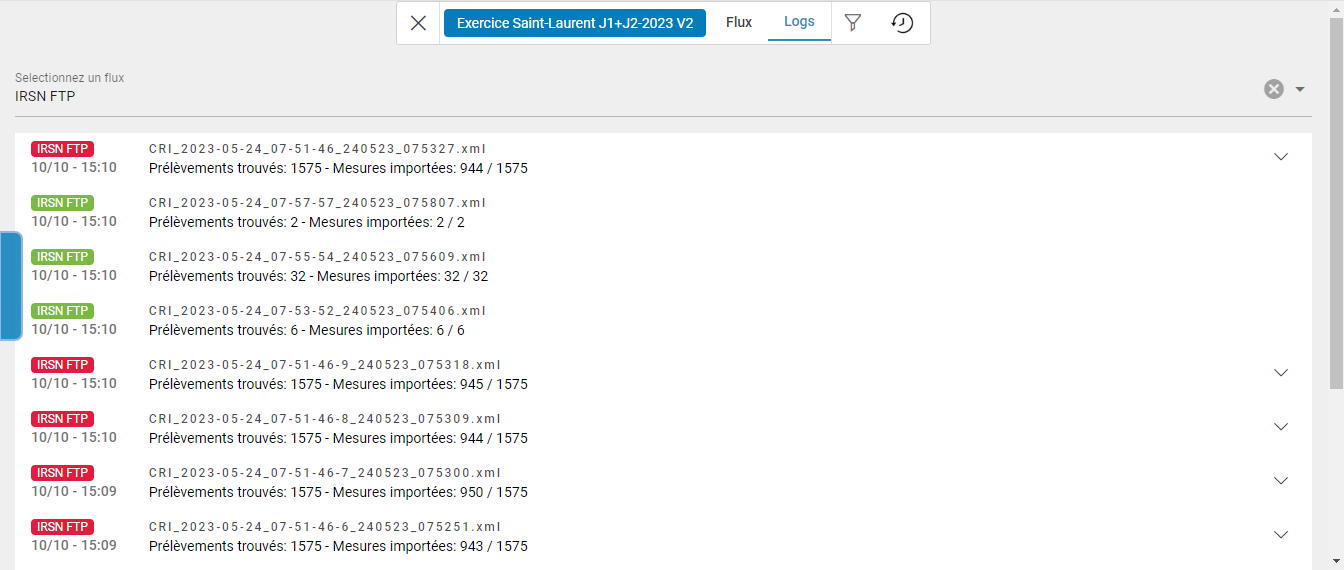 Chaque flux, entrant ou sortants, produit des logs permettant de tracer d'éventuels problèmes. Par défaut, les logs de tous les flux sont affichés mais il est possible de filtrer les logs pour chaque flux.